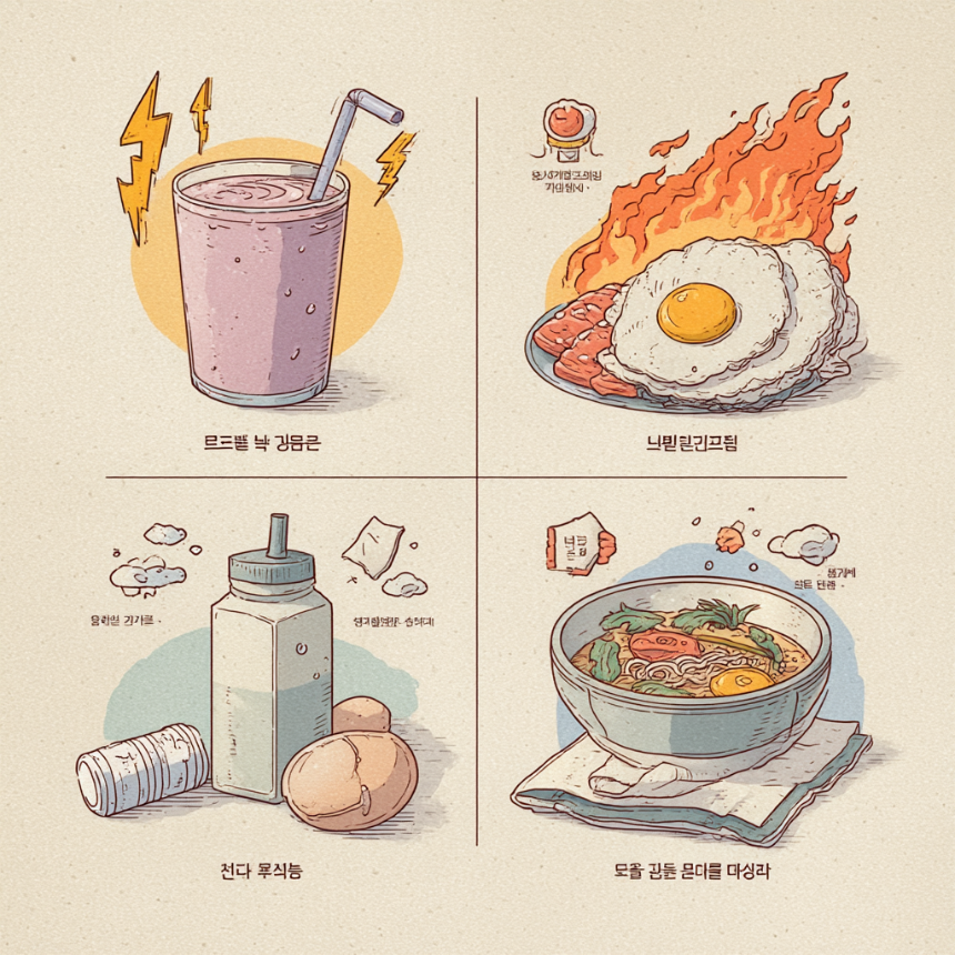 닭가슴살, 계란 등 간단한 고단백 식품이 좋습니다.