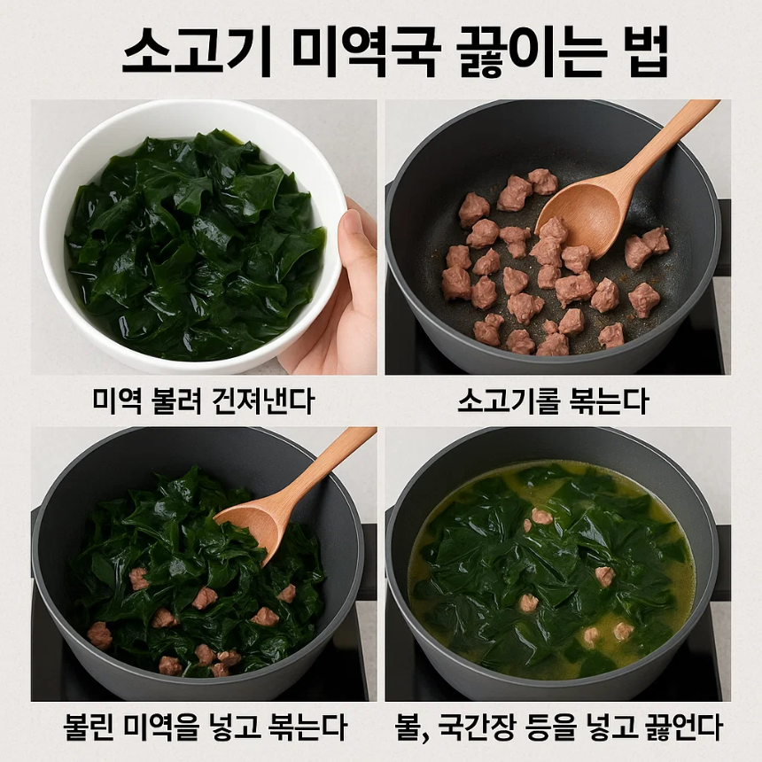 - 냄비에 참기름+소고기 볶고, 미역 추가해 더 볶기